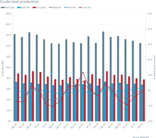 2025年8月全球70個(gè)納入世界鋼鐵協(xié)會(huì)統(tǒng)計(jì)國家/地區(qū)的粗鋼產(chǎn)量為1.453億噸,同比提高0.3%。