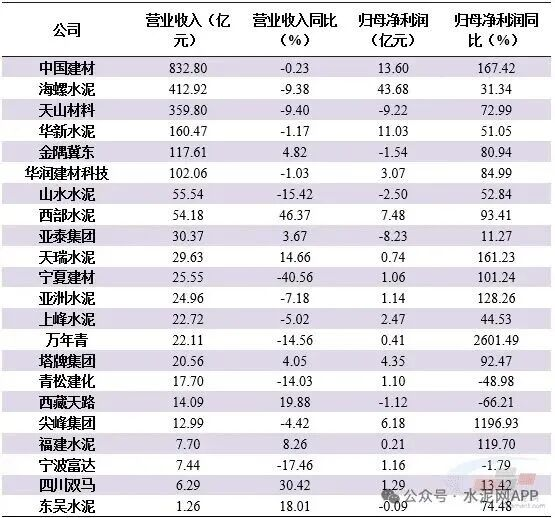 表1:2025年上半年水泥上市公司營收、利潤情況