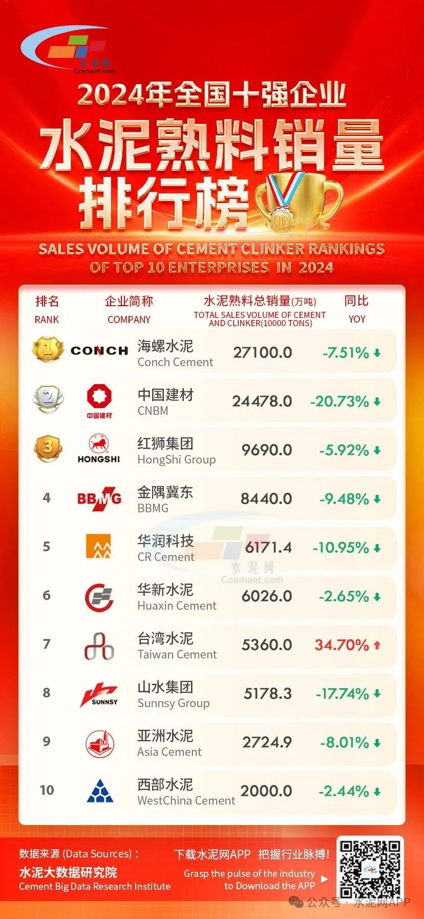 近日,中國水泥網(wǎng)發(fā)布2024年中國水泥熟料總銷量TOP10排行榜。從排名來看,2024年海螺水泥熟料總銷量27100萬噸,超越中國建材位居榜首,華新水泥、臺(tái)灣水泥均超過山水水泥,分別提升至第六位、第七位,山水水泥則下降至第八位,西部水泥進(jìn)入前十位。從銷量變化來看,僅有一家企業(yè)銷量出現(xiàn)增長,九家出現(xiàn)下降。2024年,臺(tái)灣水泥度完成土耳其、葡萄牙相關(guān)資產(chǎn)收購后,水泥熟料同比銷量大增34.7%;深度參與海外市場的華新水泥、西部水泥明顯跑贏國內(nèi)大盤,降幅較小,分別為2.65%、2.44%;中國建材、山水水泥降幅較大,特別是中國建材,水泥熟料銷量較同期下降近21%,山水水泥超過17%;華潤建材科技降幅在11%左右,金隅冀東、亞洲水泥、海螺水泥、紅獅控股集團(tuán)均低于10%,降幅分別為9.48%、8.01%、7.51%、5.92%。(注:水泥企業(yè)水泥熟料銷量是水泥銷量和熟料外銷量之和(不含自用熟料),既包括企業(yè)在國內(nèi)的銷量也包括在海外的銷量;天瑞水泥暫未披露2024年度年報(bào),不參與此次排名)