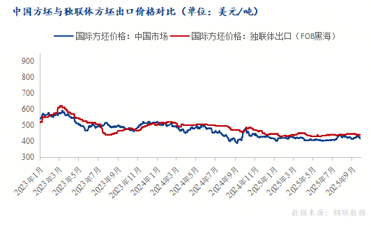 圖一:2023-2025年中國鋼坯與獨(dú)聯(lián)體方坯出口價(jià)格對比