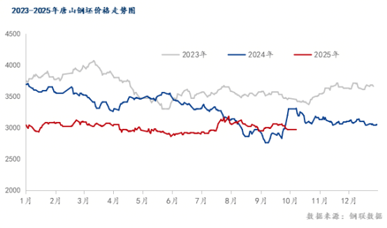 圖二:2023-2025年唐山鋼坯價(jià)格走勢圖