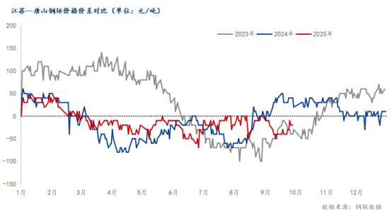 截至9月29日,唐山鋼坯出廠價(jià)報(bào)2970元/噸,較8月末下調(diào)30元/噸;江陰市場報(bào)3010元/噸,累計(jì)下調(diào)50元/噸。9月鋼坯價(jià)格先強(qiáng)后弱,上旬在宏觀利好情緒帶動下,期貨震蕩上行,同時(shí)下游調(diào)坯軋鋼企業(yè)積極生產(chǎn),鋼坯需求量持續(xù)增加,鋼坯社會庫存降庫速度較快。但隨著調(diào)坯廠持續(xù)虧損,并且成品材成交較緩,庫存壓力較大,自主停產(chǎn)增加,采坯意愿不斷走弱。市場交易多集中在貿(mào)易環(huán)節(jié),期現(xiàn)基差波動較小。此外,南北價(jià)差較小暫無跨區(qū)域流通。