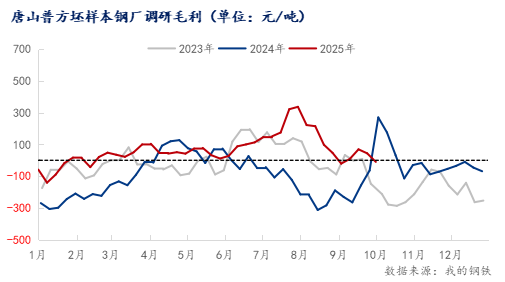 圖四:2023-2025年唐山普方坯樣本鋼廠調(diào)研毛利