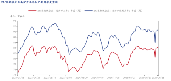 圖五:2023-2025年國內(nèi)247家鋼鐵企業(yè)高爐開工率和產(chǎn)能利用率走勢圖