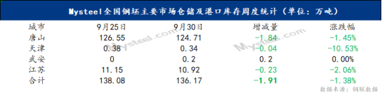 表一: Mysteel全國鋼坯主要市場倉儲及港口庫存周度統(tǒng)計(jì)