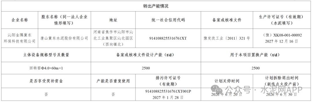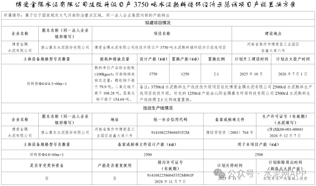 置換方案顯示,博愛金隅3750t/d水泥熟料生產(chǎn)線技改升級(jí)項(xiàng)目依托博愛金隅水泥有限公司2500t/d水泥熟料生產(chǎn)線項(xiàng)目技改升級(jí),補(bǔ)充的1250t/d產(chǎn)能由沁陽金隅冀東環(huán)保科技有限公司2500t/d水泥熟料生產(chǎn)線按照2:1比例減量置換。